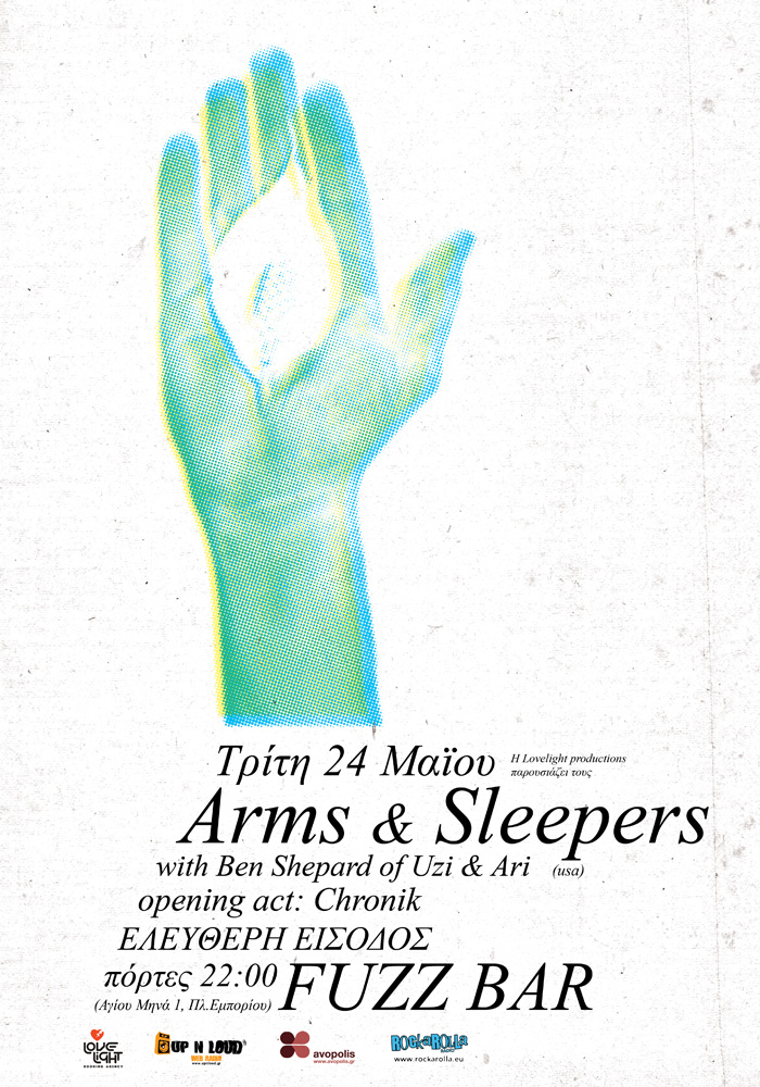Το ατμοσφαιρικό indie/ηλεκτρονικό ντουέτο των Arms And Sleepers επισκέπτεται για πρώτη φορά τη χώρα μας για δύο μοναδικές συναυλίες σε Αθήνα και Θεσσαλονίκη (23 και 24 Μαΐου σε ΤΩΡΑ Κ44 και Fuzz Bar αντίστοιχα), στα πλαίσια της παγκόσμιας περιοδείας του για το 2011!