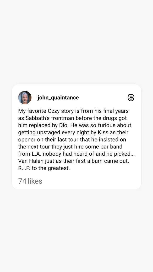΄Εφτασε λοιπόν το βιολογικό τέλος του Ozzy… ένα τέλος που όλοι ξέραμε ότι κάποια στιγμή θα έλθει αλλά κανείς δεν το περίμενε αφού θεωρούσαμε ότι ο Madman όπως ήταν εδώ “από πάντα”, έτσι και θα παραμείνει. Άλλωστε στην ερώτηση που έθεσε κάποτε “When you think about death do you lose your breath or do you keep your cool?”, ο ίδιος βρισκόταν ξεκάθαρα στην δεύτερη επιλογή.