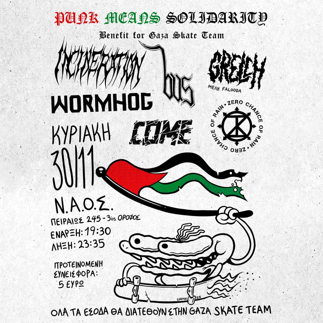Στον χώρο της συναυλίας θα υπάρχει και περιορισμένο merch από την συλλογή αλληλεγγύης Skate Punks For Gaza