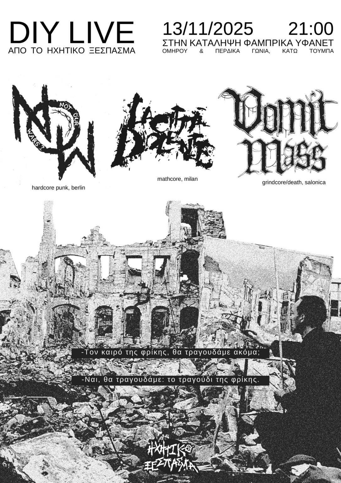 Πέμπτη 13/11, στις 21:00, στην κατάληψη Φάμπρικα Υφανέτ, D.I.Y. live απ’ την punk συναυλιακή ομάδα Ηχητικό Ξέσπασμα με τα συγκροτήματα: