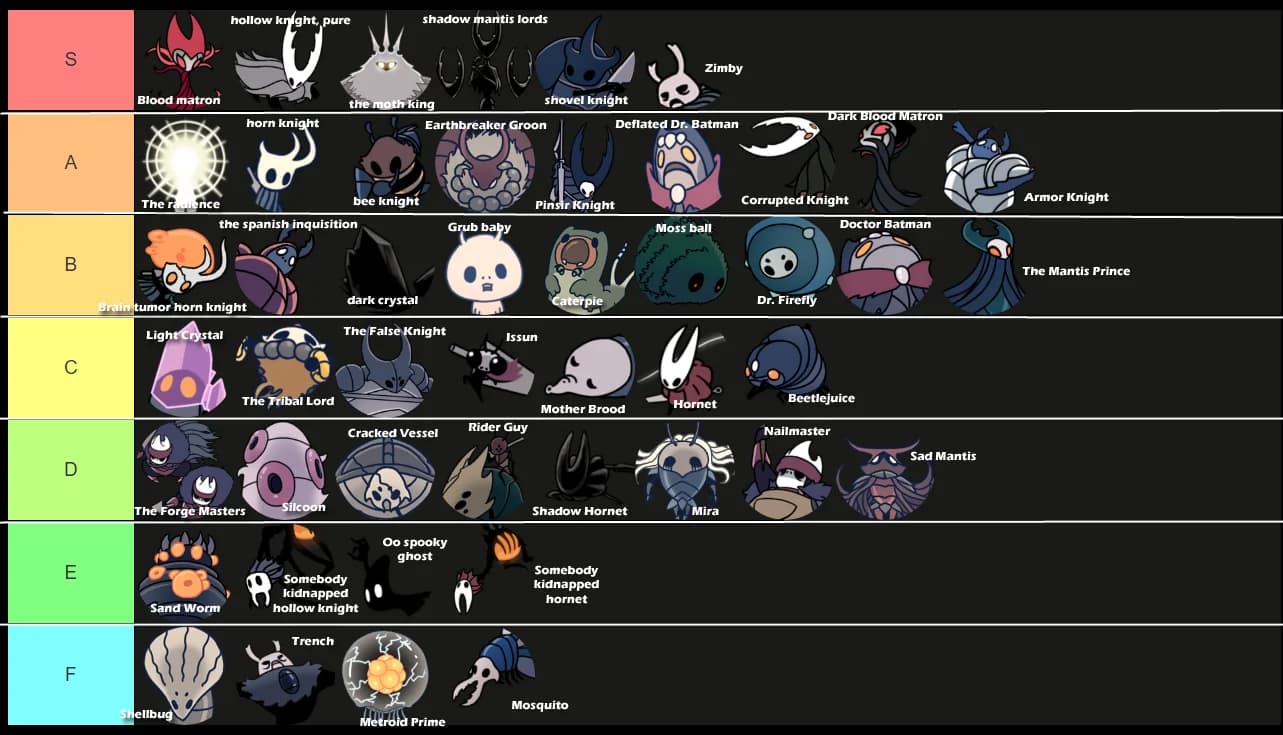 My boyfriend who loves Hollow Knight asked me to name all the bosses. I did my best. (Note: He made the tierlist I just added the names)