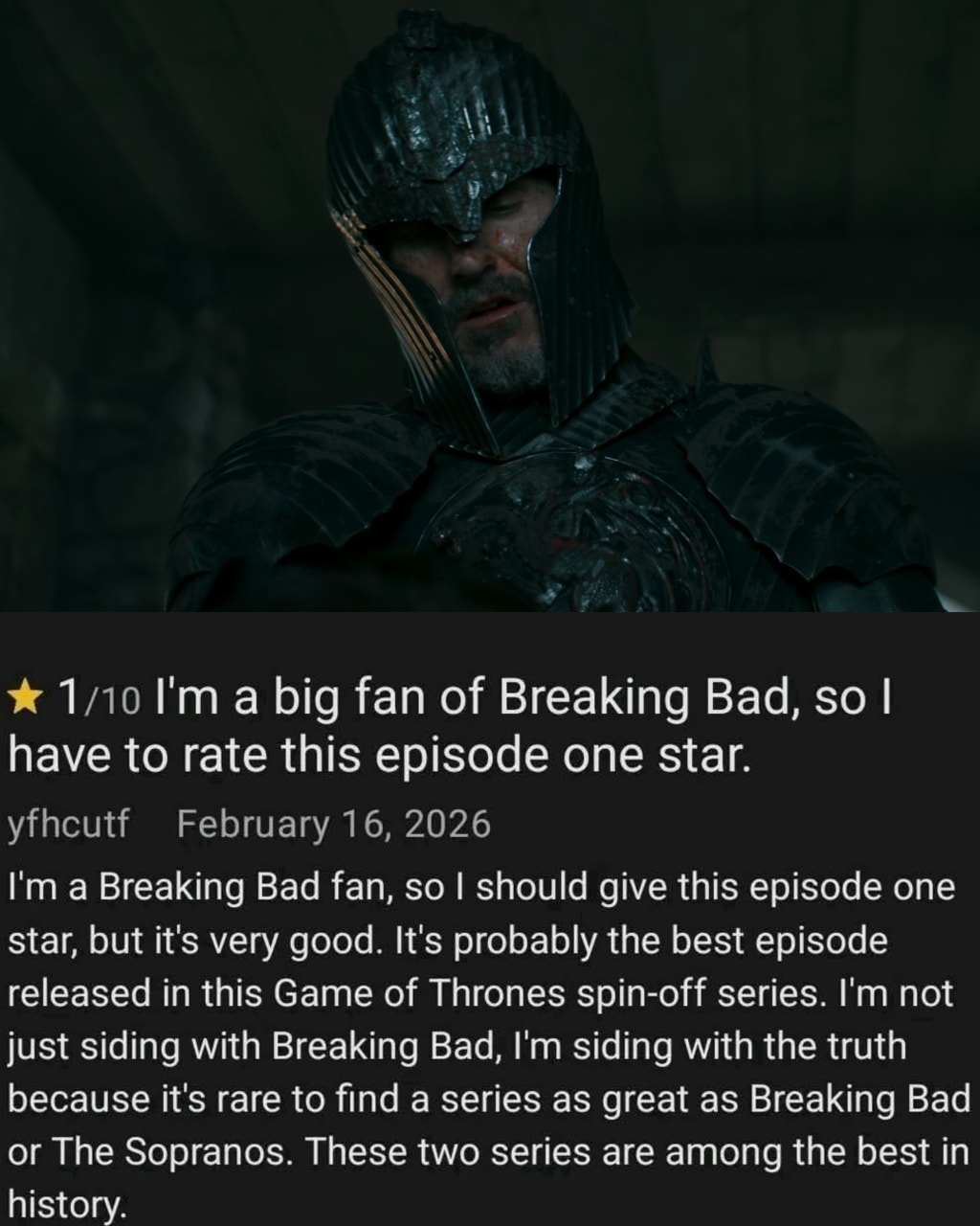 Νταξει, φανταστικη σειρα. Πολυ καλοφτιαγμενη σε ολα τα επιπεδα. Τελειο casting, αφου και ο Dunk και ο μικρουλης ειναι υπεροχοι. Τα ειπατε ολοι σας πολυ καλα, το 5ο επεισοδιο ηταν απλα τρελο emotional rollercoaster, και ζουμε για αυτα. Επισης, να πω πως μιας και δεν ειχα καμια γνωση για τους χαρακτηρες και τα plot twists απο τα βιβλια, τοσο στο τελος του 3ου οσο και στο τελος του 4ου ημουν σε φαση “πω να σου…”. Μπορει ο παππους οπως ειδαμε στην αρχη του δευτερου επεισοδιου να ειχε τεραστια… προσοντα, αλλα τα μεγαλυτερα μπαλακια τα ειχε ο Μπαελορ, ο οποιος μεσα σε λιγα επεισοδια καταφερε να γινει θαρρω απο τους πιο iconic χαρακτηρες ολου του ASOIAF cinematic universe.