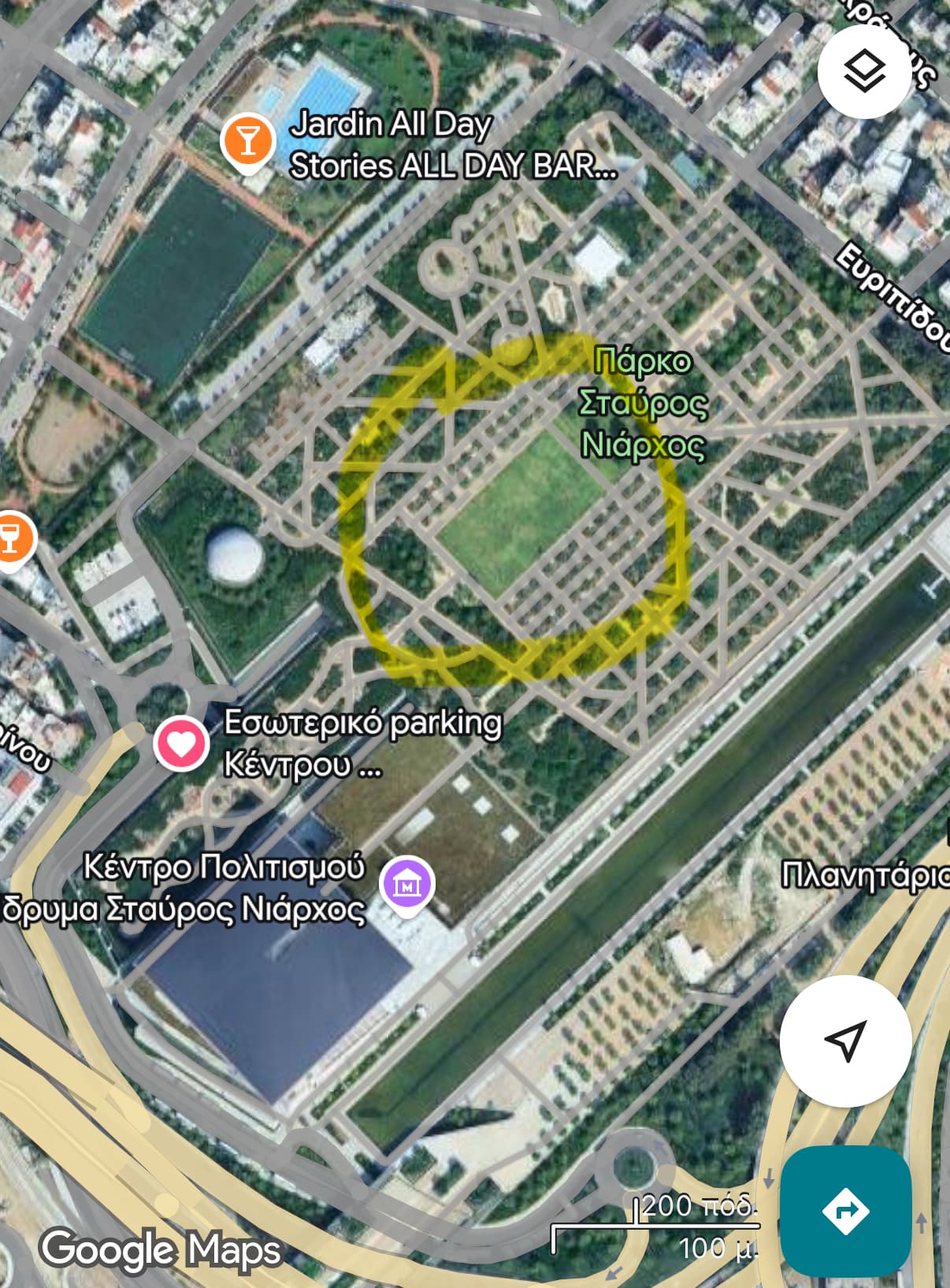 Στο Google maps βλέπω ένα χώρο με γρασίδι ακριβώς μπροστά από το κτίριο και έναν άλλο, μεγαλύτερο, λίγο πιο μακριά, στην ίδια ευθεία με το κολυμβητήριο της Καλλιθέας. Ποιον από τους δύο εννοείς;