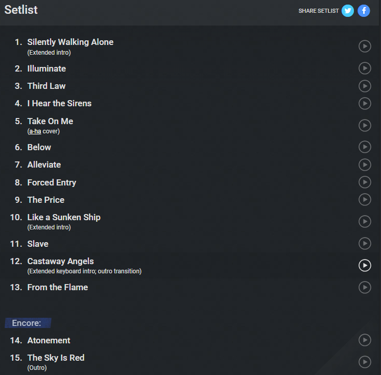 Κομματαρα το 3rd Law, αλλα μαλακια για οσους πηγαν και τις δυο μερες που το κοινο το ψηφισε αντι να παιχτει το Stuck που ειναι στα 10 καλυτερα τους τραγουδια ξερω γω.