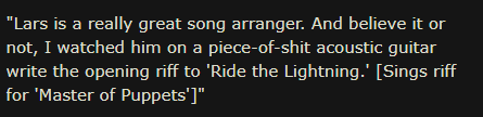 Υποψιάζομαι ότι ο Lars είχε (και συνεχίζει ενδεχομένως να έχει ) την αντίστοιχη ικανότητα που είχε ο Miles Davis , στο να κάνει δηλαδή πετυχημένα κολάζ μουσικής. Ενώ πχ οι μουσικοί του αυτοσχεδιαζανε ή πετούσανε ασύνδετες ιδέες και μοτίβα αυτός τα έβαζε σε μια σειρά που να αναδεικνύει το κομμάτι. Προφανώς υπάρχουν διαφορές μεταξύ μέταλ και τζαζ αλλά αυτή είναι η ουσία.