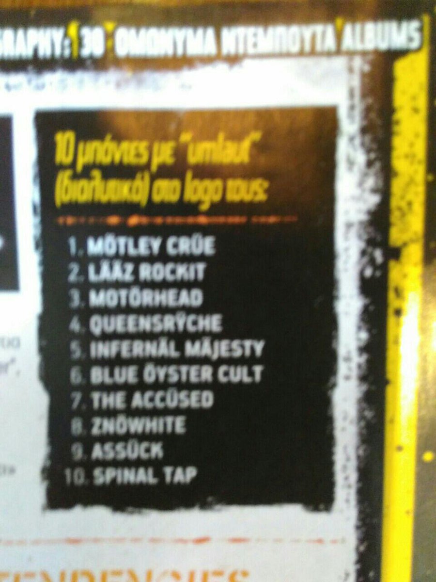 Ανεκδιήγητο ήταν, όχι απλά κακό. Όπως σωστά παρατήρησε ο stef το μόνο που είχε συνοχή ήταν αυτό με τα πρωτο-metal συγκροτήματα κι αυτό γιατί είχε ουσία στη θεματική του και σωστή κειμενογραφία. Π.χ. και τα concept album θα μπορούσε να βγει ωραίο (παλιότερα είχαν κάνει μια τέτοια αφιερωματάρα, κάπου το '99-'00), αλλά έτσι όπως επέλεξαν να το κάνουν (μικρός χώρος για κάθε album, πολύ συνοπτικές περιγραφές) δεν είχε να σου δώσει κάτι ιδιαίτερο. Τα βασικά, ρε παιδιά, εδώ έκαναν αφιέρωμα στους εικονογράφους και οι φάτσες τους έπιαναν μεγαλύτερο χώρο από το τοσοδούλι εξώφυλλο-sample, δηλαδή μιλάμε για χαζά, βασικά πράματα. Ε οι περισσότερες θεματικές ήταν χαζές ούτως ή άλλως, όπως και οι τυχαίες επιλογές, χωρίς κάποιο ιδιαίτερο κριτήριο ποιότητας, απλά ενδεικτικές λίστες. Δεν πειράζει, του χρόνου (αν υπάρχει ακόμα).