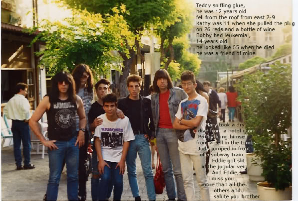 Τον Μάιο του 1989 έκανε κολοζέστη και αφραγκία.Αφραγκία έκανε όλο τον χρόνο άλλα όταν ήθελες τα χρήματα για να αγοράσεις εισητήριο για τους Ramones σε πείραζε πιο πολύ.Καλά τα live με τις εγχώριες μπάντες που αγαπάς (μην σου πώ καλύτερα, όχι απλώς καλά) αλλά ρε γαμώτο σάμπως είχα ξαναδεί πάνκ μπάντα τέτοιου βεληνεκούς? Και χτυπάει το τηλέφωνο μεσημεριάτικα και άντε πρόλαβε το μην ξυπνήσει ο πατέρας σου και είναι ο Σταύρος “έλα ρε είμαι στη Φωκίωνος και είναι οι Ramones σε μια ταβέρνα και τρώνε, έχεις φωτογραφική μηχανή?”.Βέβαια, αυτή η φωτογραφία θα άξιζε όσο πενήντα του μεγάλου Σταύρου με τον Σάβατζ & τον Αντίχριστο όταν θα άνοιγε το πορτοφόλι και θα την έδειχνε.“Τι λες μωρέ μαλάκα, σίγουρος είσαι? Νίκο έχουμε φίλμ? Κάτσε περνάω απο το μαγαζί να πάρω φίλμ, παίρνουμε τον Μάχο και τον Κωστα & ερχόμαστε”