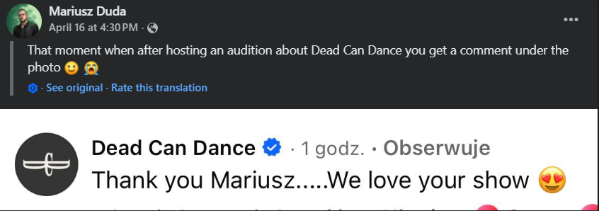 Στο μεταξύ τις προάλλες νομίζω είχα μπει στο προφίλ του και μου εμφάνιζε μεταφρασμένα τα posts από τα πολωνικά, και κάπου έγραφε (η μετάφραση) ότι πέρασε από audition για τους Dead Can Dance. Δεν το βρίσκω τώρα. Όχι ότι και οι DCD είναι η τέρμα ενεργή μπάντα ή ότι θα είναι κάτι παραπάνω από hired hand σε περίπτωση που αποφασίσει ο Perry να περιοδεύσει. Αλλά ίσως έπαιξε το ρόλο του κι αυτό;