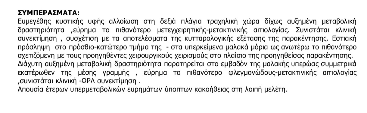 Έκανα προχθές pet CT, τα αποτελέσματα δείχνουν καλά. Δεν υπάρχουν μεταστάσεις.