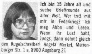 Η κυρία στην παραπάνω φωτογραφία, δεν είναι άλλη από την παντοδύναμη Άγκελα Μέρκελ, τότε που ως 15χρονη παιδούλα έψαχνε συντροφιά μέσω αλληλογραφίας…Κρίμα που δεν είχαμε τότε facebook. Θα είχε λήξει το ζήτημα τώρα…