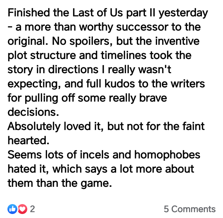 Χωρις να εχω γνωρισει τον φιλο (και ουτε προκειται), οσοι λενε “δε σας αρεσε το παιχνιδι επειδη ειστε ομοφοβικοι” ειναι απλα καθυστερημενοι.