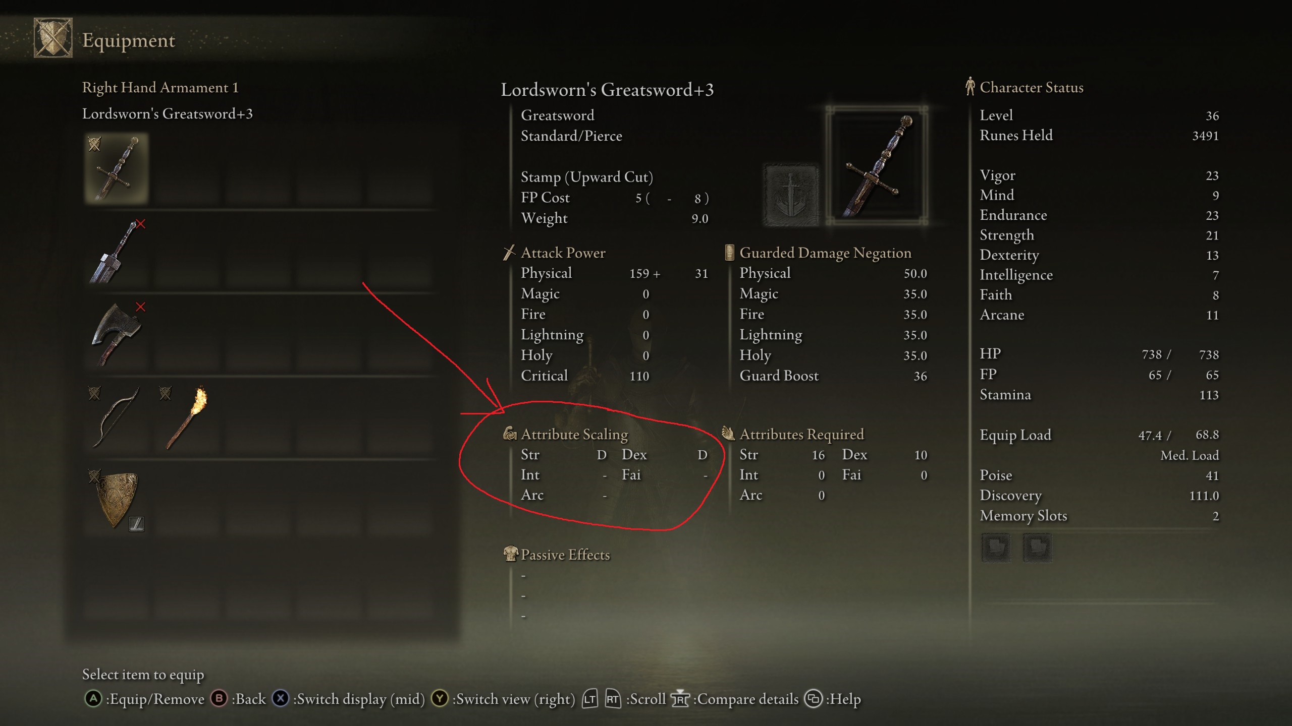 Το όπλο λέει ότι κάνει D scaling με STR και D με DEX. Αυτό σημαίνει ότι όσο περισσότερο ανεβάζω STR και DEX, τόσο περισσότερο damage output θα έχω απ’ το όπλο. Το D επίσης, είναι αρκετό χαμηλό. Αυτό ανεβαίνει κάνοντας upgrade το όπλο, όπως επίσης υπάρχουν και διάφορα όπλα με άλλα και καλύτερα scaling. Η βαθμίδα, αν θυμάμαι καλά είναι E με S. Δηλαδή κατάλαβες, αν πχ σου αρέσει ένα όπλο και θες να πορευτείς με αυτό, και έχει C scaling με DEX, ε θα ανεβάζεις DEX και όχι STR γιατί αλλιώς είναι counter-productive.