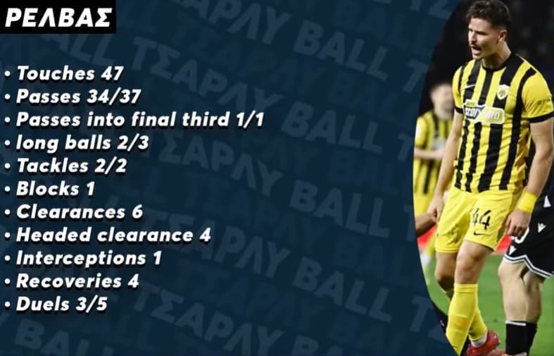 Βασικός από την πρώτη μέρα, σταθερός σε απόδοση, καλός στα μαρκαρίσματα, καλός στις τοποθετήσεις, καλός με τη μπάλα στα πόδια, καλός με τα χωριά, καλός στα ντέρμπι. Η ΑΕΚ υπήρξε διστακτική στην αντικατάσταση του Βίντα (και πέρσι τον άφησε να κάει παίζοντας ασταμάτητα όλη τη σεζόν), όμως με Ρέλβας βρήκε έναν παίκτη που έχει συμμαζέψει την άμυνα, έχει επιτρέψει στον Μουκουντί να παίζει στην κανονική του θέση και είναι εύκολα ανάμεσα στους 2-3 καλύτερους στόπερ της φετινής Superleague.