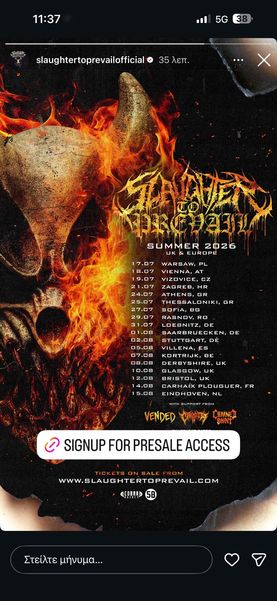 Οι Slaughter To Prevail είναι πιθανότατα η deathcore μπάντα που με ενδιαφέρει λιγότερο (από τις μεγάλες). Παρόλα αυτά, τους έχει δει ο κολλητός μου και λέει ότι live σπέρνουν. Οπότε μάλλον θα τιμήσουμε. (+ ότι θέλουν στήριξη τέτοια live για να έχουμε ελπίδες να βλέπουμε τέτοιες μπάντες στη χώρα μας).