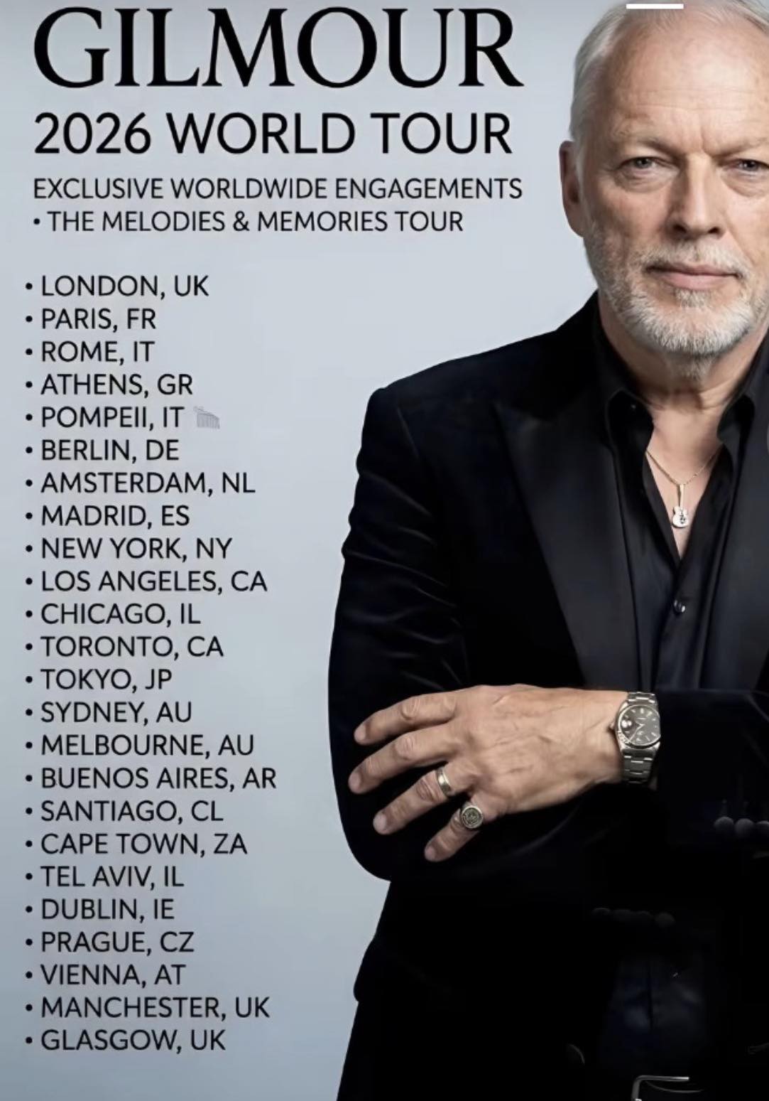Επισης, ειναι λιγο τρελο για εναν τυπο 80 χρονων να μπει σε ενα σωρο υπερωκεανιες πτησεις μεσα σε λιγους μηνες και να ξεκινησει απο Ευρωπη, να παει Αμερικη, μετα Ιαπωνια, Αυστραλια, Νοτια Αμερικη και παλι Ευρωπη. Οχι οτι το αεροπλανο του Γκιλμουρ θα στερειτει ανεσης, αλλα και παλι. Για να γινει σωστο promotion κτλ το νωριτερο που θα μπορουσαν να ξεκινησουν αυτες οι συναυλιες ειναι Σεπτεμβριος, και σιγα μην μπει σε 20 αεροπλανα (μερικα για 15 ωρες) μεσα σε ενα τριμηνο.