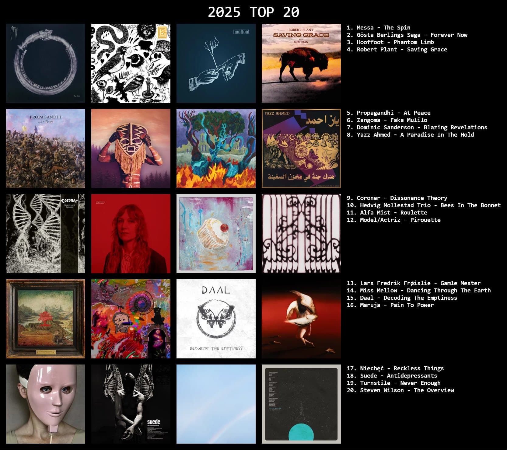 Φέτος άκουσα αισθητά λιγότερη νέα μουσική από προηγούμενες χρονιές, και όχι ιδιαίτερα συγκροτημένα. Κοινως χαθηκα σε περιεγες ειδολογικες λαγουδοτρυπες. Πολλές αξιόλογες κυκλοφορίες ενώ τις εκτίμησα στις 4-5 ακροάσεις, δεν δέθηκα παραπέρα μαζί τους, πολλές, που περίμενα να είναι εξαιρετικές, με απογοήτευσαν, ενώ αρκετές επιστροφές δεν μου είπαν προσωπικά τίποτα, και προτίμησα να μην ασχοληθώ παραπάνω, μην χαλάσω και τον μύθο τους στο μυαλό μου. Coroner (και) για εσας λεω. Μάλλον γίνομαι γεροπαράξενος, και αυτό φαίνεται και στη φετινή μου λίστα.