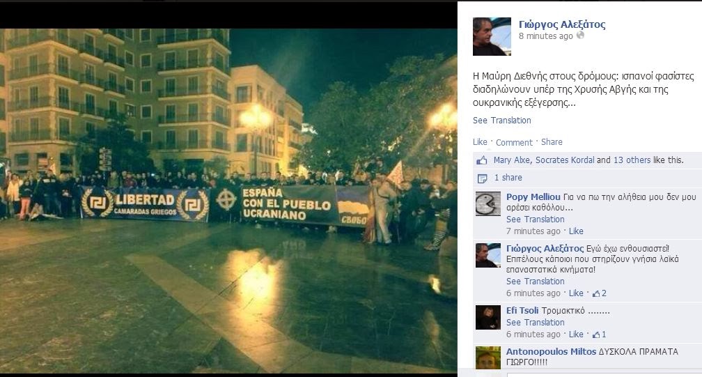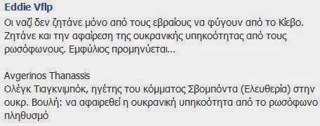 Εν τω μεταξύ, πέρα από τις φλυαρίες σας, στην Ουκρανία συνεχίζεται το πραξικόπημα. Ο πρόεδρος (αν μπορεί να λέγεται έτσι πια) Γιανουκόβιτς ήταν κατώτερος των περιστάσεων και άφησε τη χώρα στο έλεος ενός συνόλου από εθνικιστές, τραμπούκους και νεοναζί. Η διάλυση της χώρας σε ανατολικό και δυτικό τμήμα φαίνεται πιο κοντά από ποτέ.