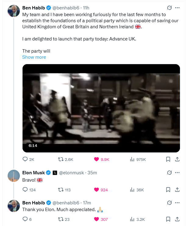 Ο Έλον Μασκ ξέρετε ποιο κόμμα υποστηρίζει στην Αγγλία; Υποστηρίζει τον Ben Habib και τον Rupert Lowe. Δύο ανύπαρκτους τύπους που τους ξέρουν μόνο στο τουίτερ (οι περισσότεροι Άγγλοι στην πραγματική ζωή δεν τους ξέρουν) και επειδή δεν πρόκειται ποτέ να δουν εξουσία, ούτε καν να μπουν στη Βουλή, γράφουν συνέχεια για μαζικές απελάσεις για να αρέσουν στο κοινό που τους παρακολουθεί (talk is cheap που λένε και στο χωριό μου). Απελάστε τους όλους, αυτή είναι η γραμμή τους και παίρνουν αρκετά like από το eco chamber του X. Κράζουν συνεχώς τον Φάρατζ ότι δεν θέλει να κάνει μαζικές απελάσεις (και όντως δεν θέλει και καλά κάνει) και ουσιαστικά η μόνη τους επιδίωξη είναι να του κόψουν ψήφους. Με αυτούς πάει και συντάσσεται ο πυροβολημένος ο Μασκ. Με αυτούς έχει συνταχτεί και ο Τόμι Ρόμπινσον και όλοι αυτοί μαζί βρίζουν τον Φάρατζ.