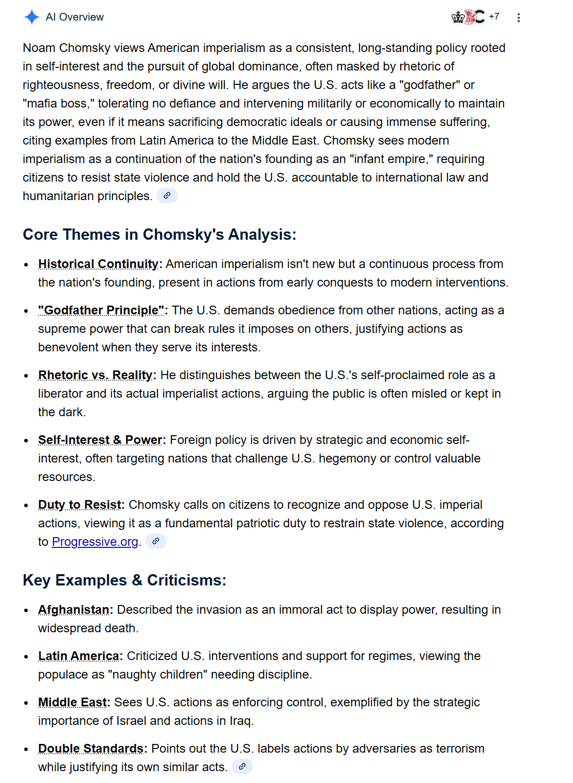 Noam Chomsky views American imperialism as a consistent, long-standing policy rooted in self-interest and the pursuit of global dominance, often masked by rhetoric of righteousness, freedom, or divine will. He argues the U.S. acts like a “godfather” or “mafia boss,” tolerating no defiance and intervening militarily or economically to maintain its power, even if it means sacrificing democratic ideals or causing immense suffering, citing examples from Latin America to the Middle East. Chomsky sees modern imperialism as a continuation of the nation’s founding as an “infant empire,” requiring citizens to resist state violence and hold the U.S. accountable to international law and humanitarian principles.